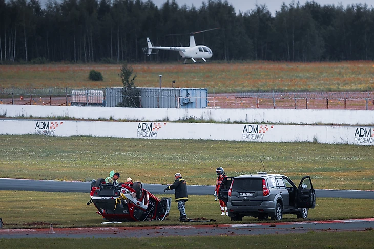 Первым пробовать воздушное пространство над трассой взялся Максим Гроссман. Харизматичный пилот TimeUp на тренировках вылетел с асфальта и на неровной обочине «нашел» такую кочку, которая отправила его «Тойоту» Mark II в зрелищный полет. Отделался пилот легким испугом и новыми впечатлениями, а команде пришлось срочно восстанавливать автомобиль.