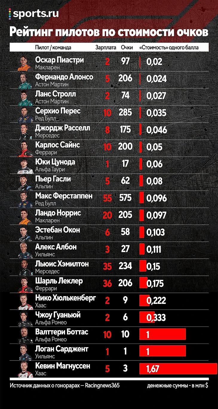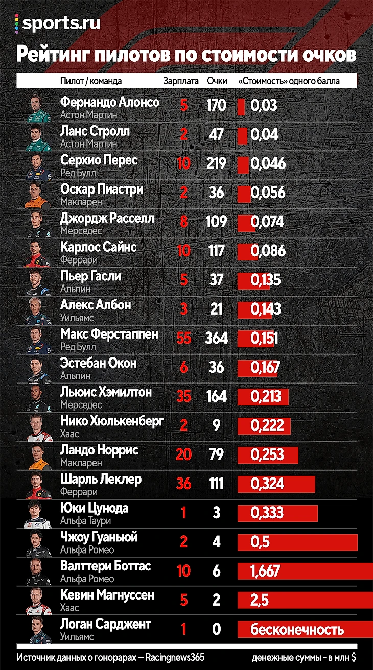 Но насколько такие вложения могут окупаться в смысле соотношения цены и очков? Оправданы ли гонорары Макса Ферстаппена в 55 миллионов и Шарля Леклера в 35 миллионов? Кому из гонщиков недоплачивают, а кто явно выступает эффективнее ожидаемого? Мы решили изучить вопрос путем оценки «стоимости» одного балла для команды.