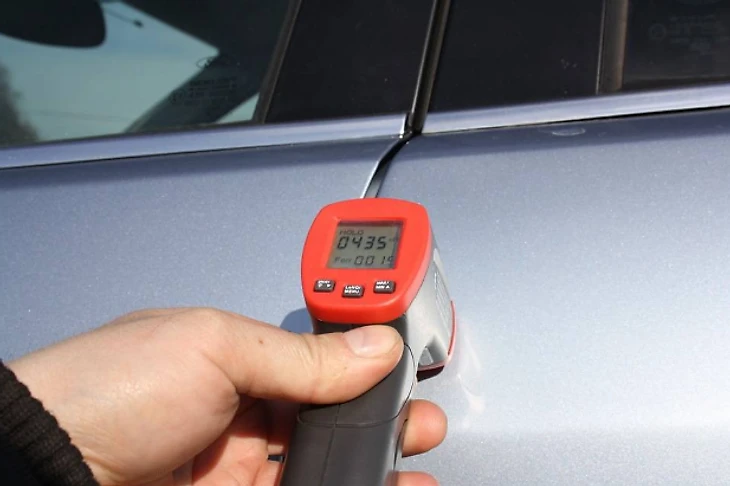 В таких ситуациях стоит воспользоваться прибором для определения толщины ЛКП – толщиномером. Стоимость прибора 5-7 тысяч рублей, покупать его для одноразового применения нет смысла, но можно взять недорого в аренду с посуточной оплатой. До начала применения толщиномера его нужно откалибровать. Для этого применяются особые пластины и пленка известной толщины. Сначала прибор ставят на пустую пластину, что обнуляет его показания, затем прикладывают к пластине с пленкой. Правильно откалиброванное устройство покажет те цифры, которые напечатаны на пленке. Затем прикладываем прибор к поверхности кузова под углом 90 градусов и смотрим на экран. Наружные детали кузова имеют следующую толщину заводского слоя ЛКП: для алюминия – до 100 мкм, для стали – до 250 мкм. Для косметической покраски и нанесения второго слоя характерны вдвое большие цифры: 250-500 мкм. Если же проводилось ремонтное окрашивание и шпатлевание, толщина ЛКП достигает значений более 500 мкм.