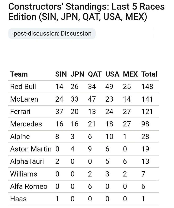 Кубок конструкторов за последние 5 этапов вообще направляет уровень зеленого болида куда-то в район «Альфа Таури»: