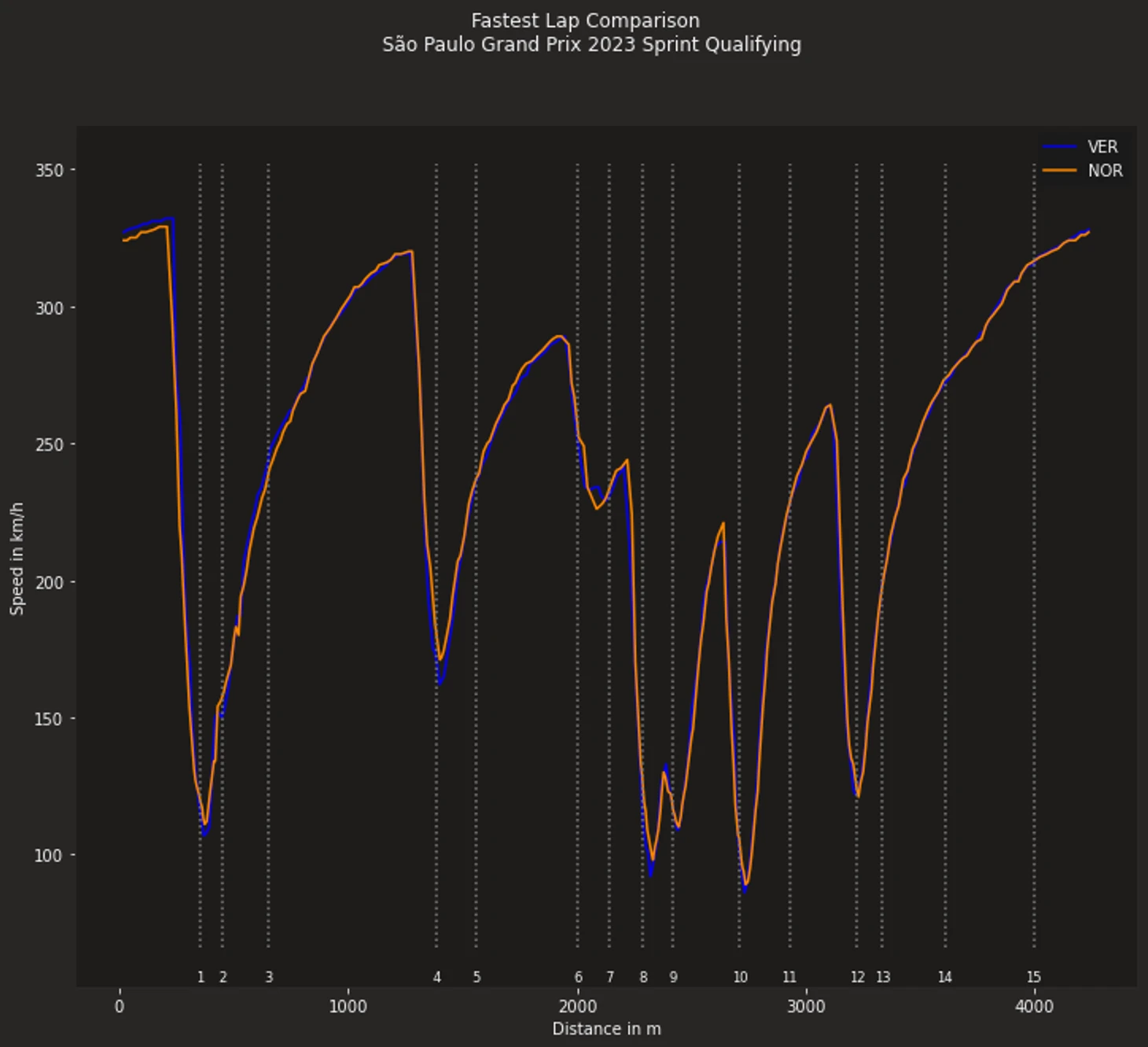 По оси у- отложена скорость каждого гонщика, по оси х - отложена дистанция трассы. Вертикальными линиями показаны номера соответствующих поворотов. Синим цветом показан график скорости - Макса Ферстаппена, а оранжевым соответственно Ландо Норрис.