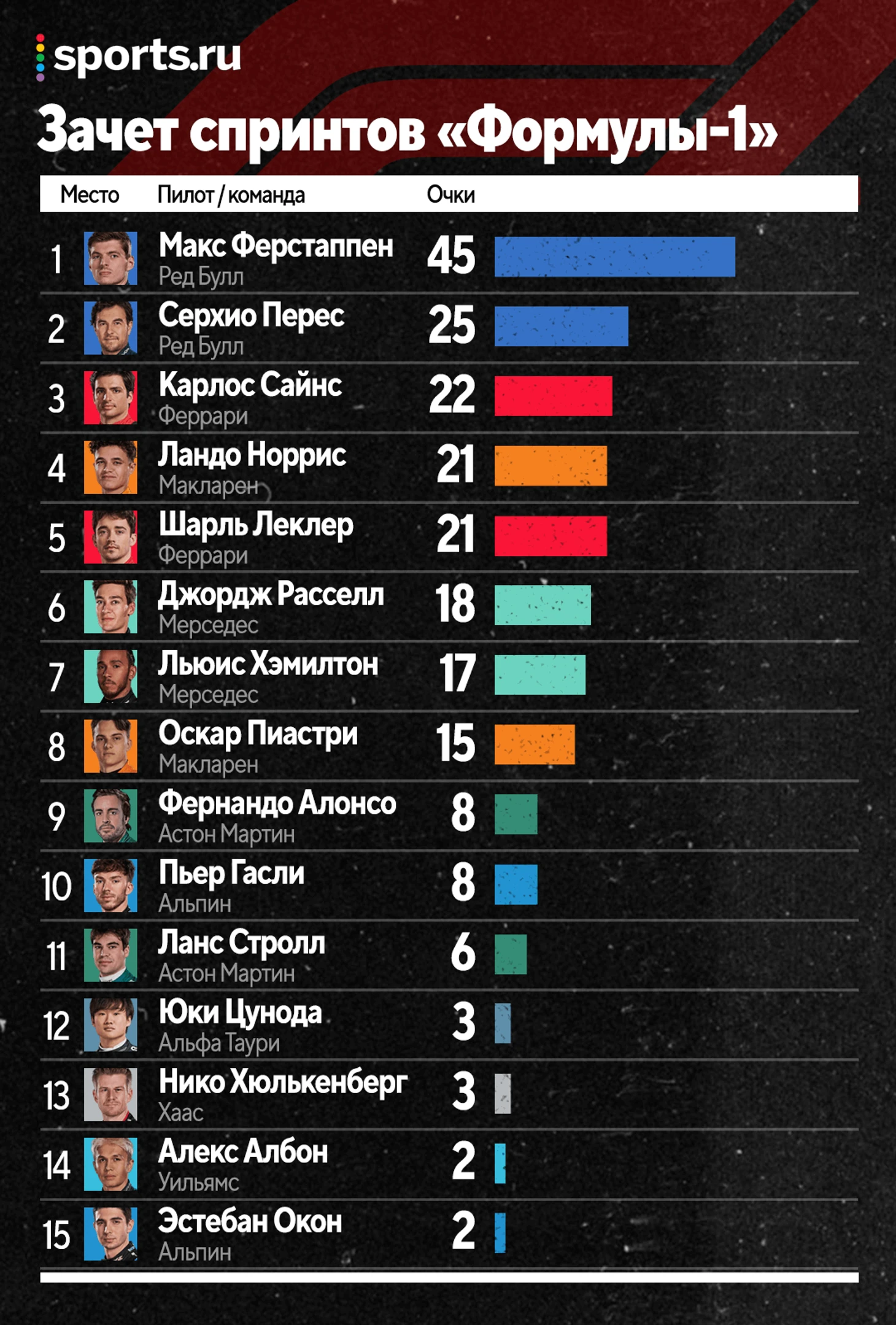 Да, Ферстаппен все еще первый с колоссальным отрывом, а Перес все еще второй – но забрал позицию буквально на последнем этапе. Оба пилота «Феррари» и Норрис до последнего стремились хоть здесь прервать доминирование «Ред Булл».