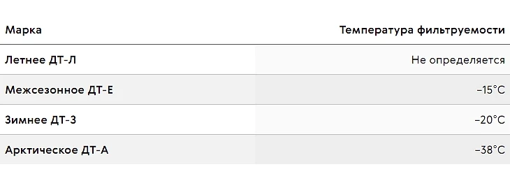 Ниже представлена таблица, с указанием марок и температур фильтруемости всех основных видов диз. топлива.