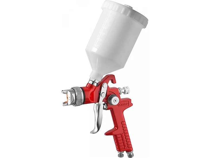 Объем бачка бывает тоже разный. Все зависит от того, куда вы собираетесь наносить краску. Если объекты небольшие — в случае с автомобилем это может быть бампер или дверца, а в случае с бытовыми предметами стул или скамейка, объем бачка составляет от четырехсот до шестисот миллилитров. К тому же с небольшими емкостями рука устает не так сильно.