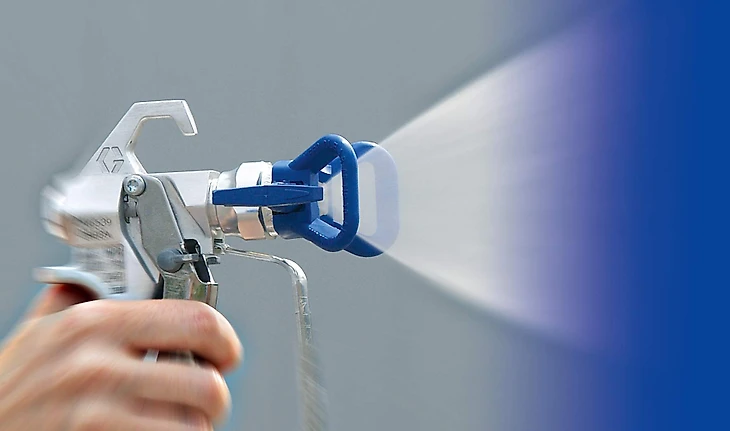 В безвоздушных моделях работает поршневый насос, который создает давление и нагнетает жидкость к соплу. Оттуда она распыляется на поверхность, но капли получаются достаточно крупными из-за чего возникают подтеки. Такие модели напоминают принцип работы пульверизатора — краска выталкивается под давлением. При толстом слое краски стоит забыть об экономичности, да и качество работы будет оставлять желать лучшего. Для тонких работ безвоздушные модели не предусмотрены, а вот покрасить ворота гаража — запросто.