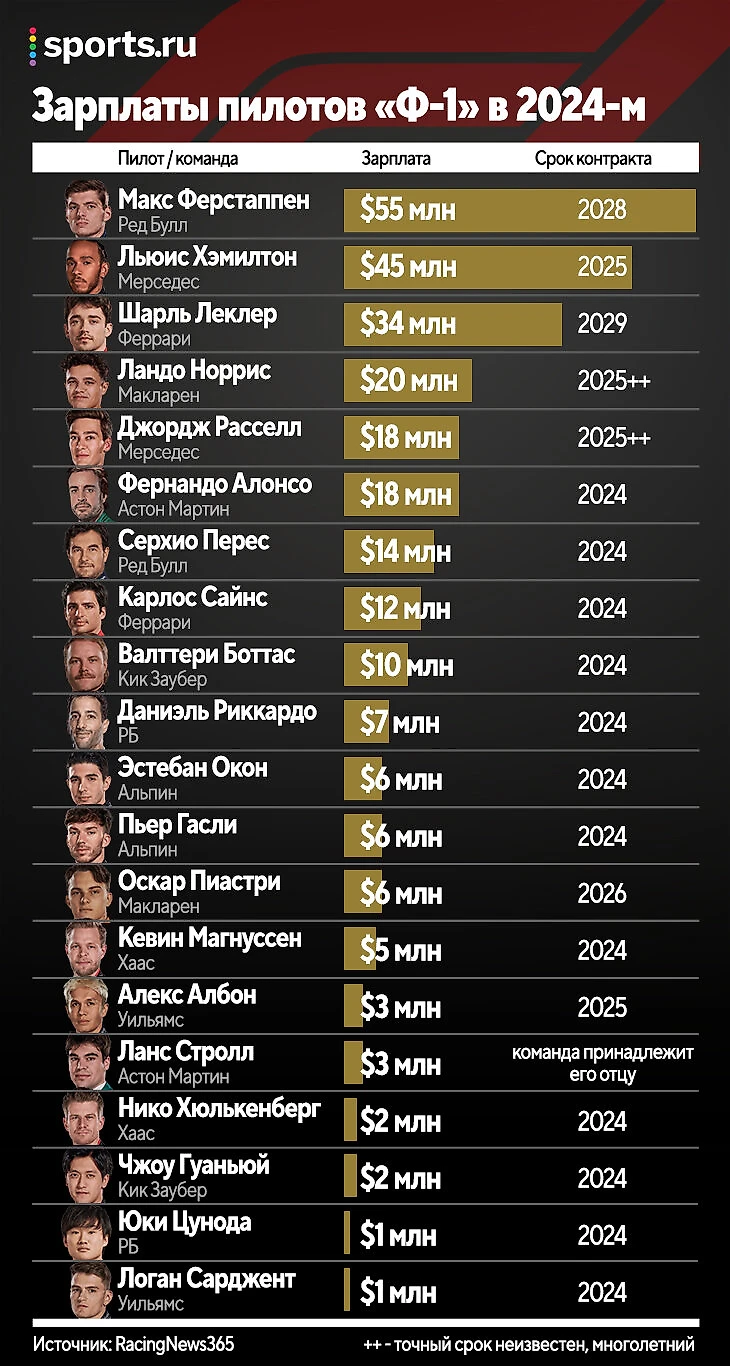 Рейтинг за 2024-й с учетом всех последних продлений, переподписаний, трансферов и слухов выглядит так – речь именно о контрактных «гарантированных» (т. е. Гонорар + неденежные бенефиты и самые легкодостижимые бонусы) заработках от команд, без рекламных и коммерческих сделок. 268 миллионов долларов на 20 пилотов!
