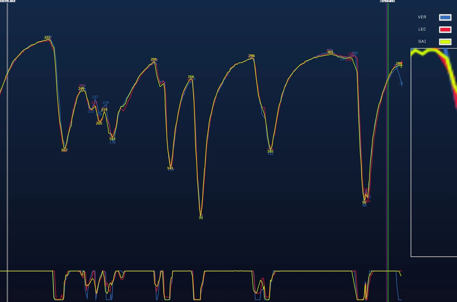 А это уже данные кругов на «софте». Посмотрите, как Леклеру (красные графики) вновь тяжело в медленных поворотах: ему приходится часто корректировать разгон и в целом сложно работать с педалью (нижние графики) – на его фоне Карлос (желтый) выглядит намного увереннее. Похоже, и тут дело в плохо прогретых шинах.