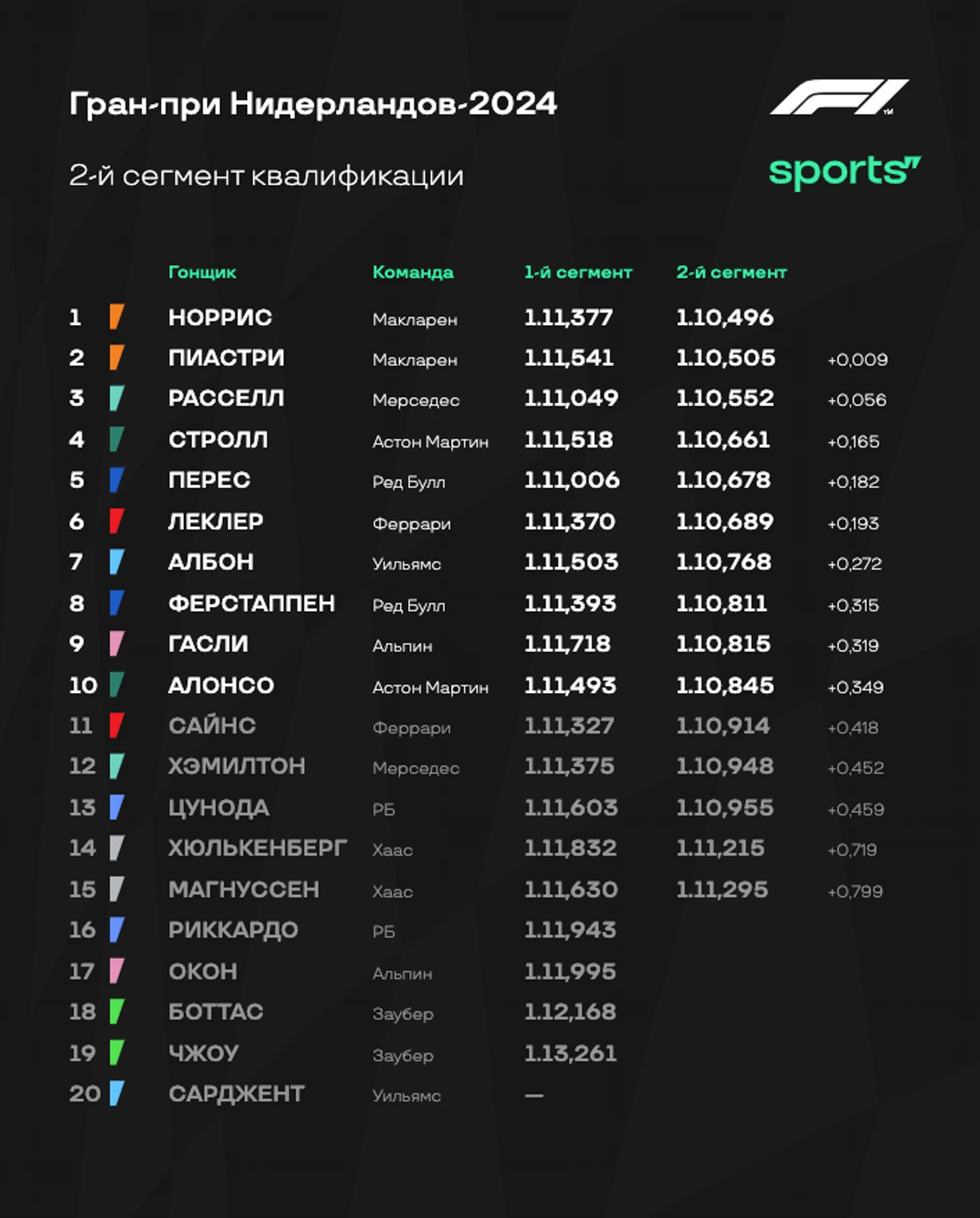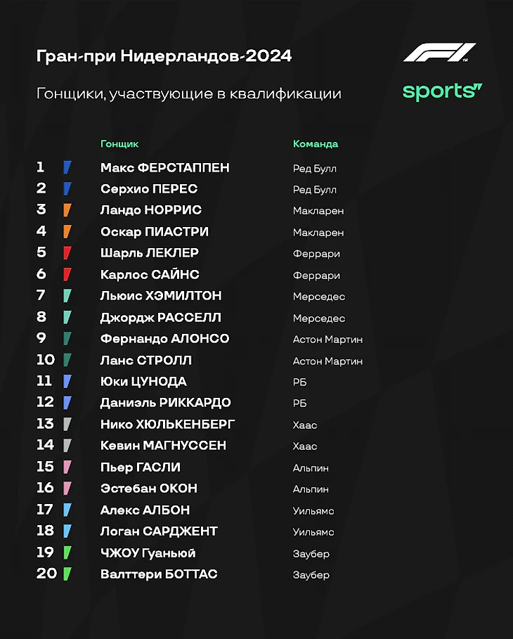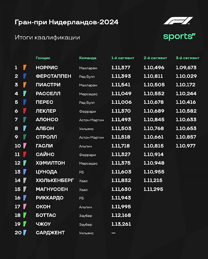 24 августа состоится квалификация к 15-му этапу «Формулы-1» сезона-2024, Гран-при Нидерландов.