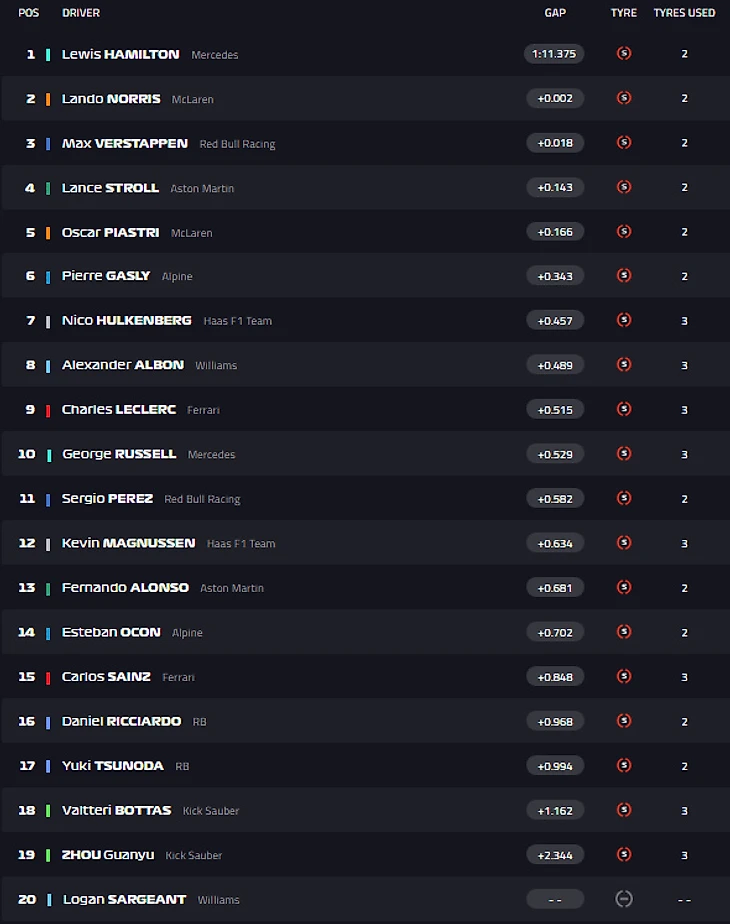 А вот и время Макса. Невероятная плотность в первой тройке: Норрис уступает Льюису 0,002 секунды, а Ферстаппен - 0,018.