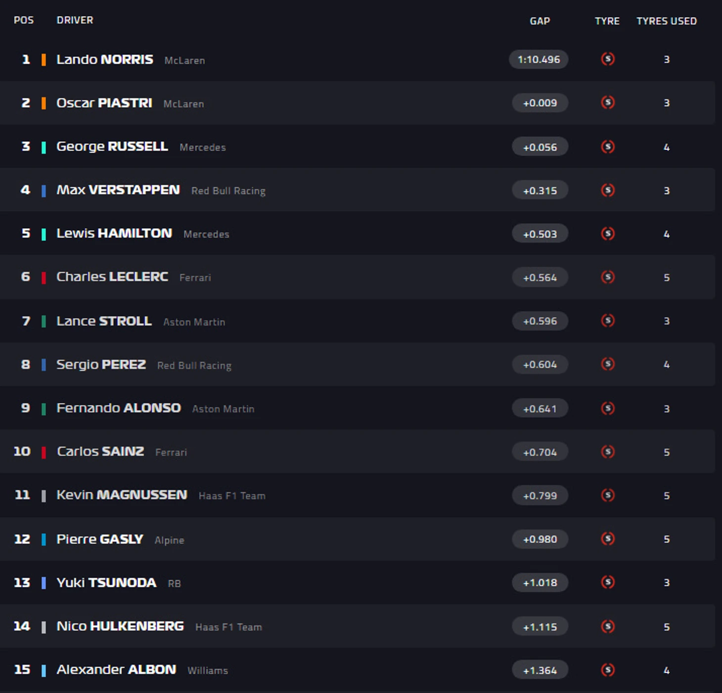 Норрис и Пиастри занимают первые два места - разница минимальная (всего в 0,009). Далее Расселл - ему не хватает 0,056. Остальные подальше. «Ред Булл» продолжает регрессировать.