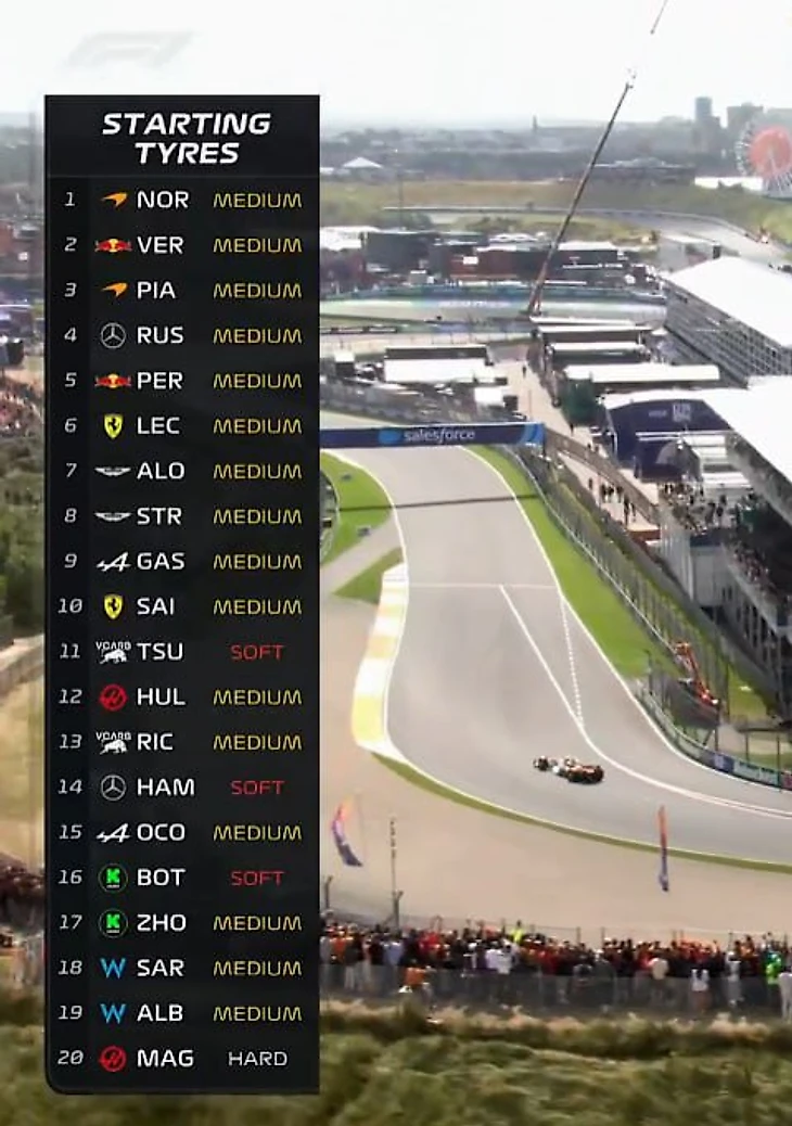 Но от борьбы не собирался отказываться только «Мерседес» – Расселл сразу заявил о планах на схватку с «Макларенами». Самым реальным шансом опередить кого-то (помимо стратегии) оставался старт, однако на «Зандворте» первый рывок – один из самых коротких в пелотоне и теоретически должен был помочь лидерам. Оттого рискнуть с жесткими составами на начальных метрах могли только истинные стоики – ведь именно проигрыш лишних 3-4 метров в зоне торможения из-за покрышек и могли оказаться критическими для финишной позиции.