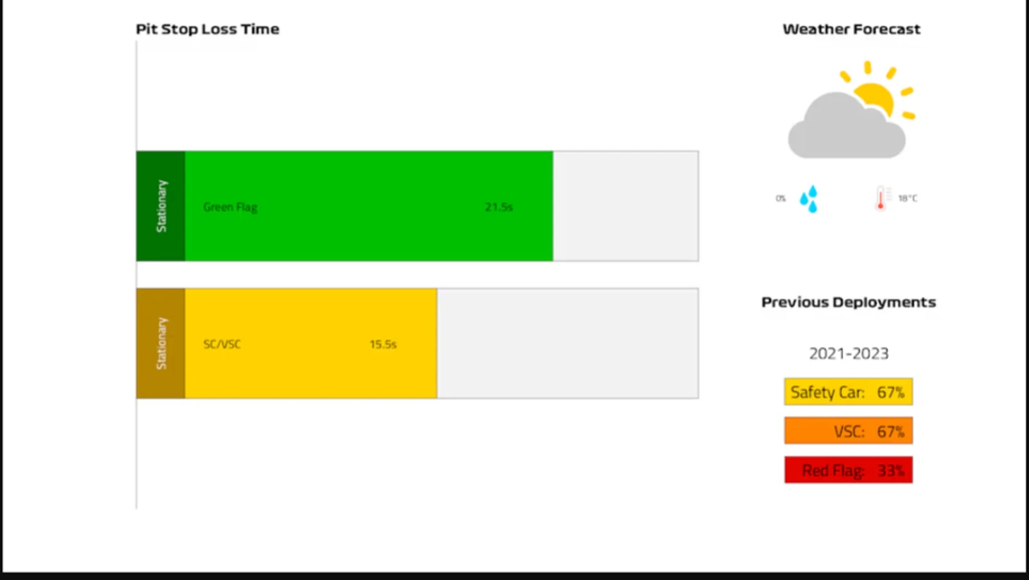 Важнейшим фактором осталась и большая вероятность автомобиля безопасности, и большая потеря времени на пит-стопе из-за длинного и узкого пит-лейн с ограничением скорости в 60 км/ч против обычных 80 км/ч. Потому выбор правильного окна для остановки виделся настолько критичным.