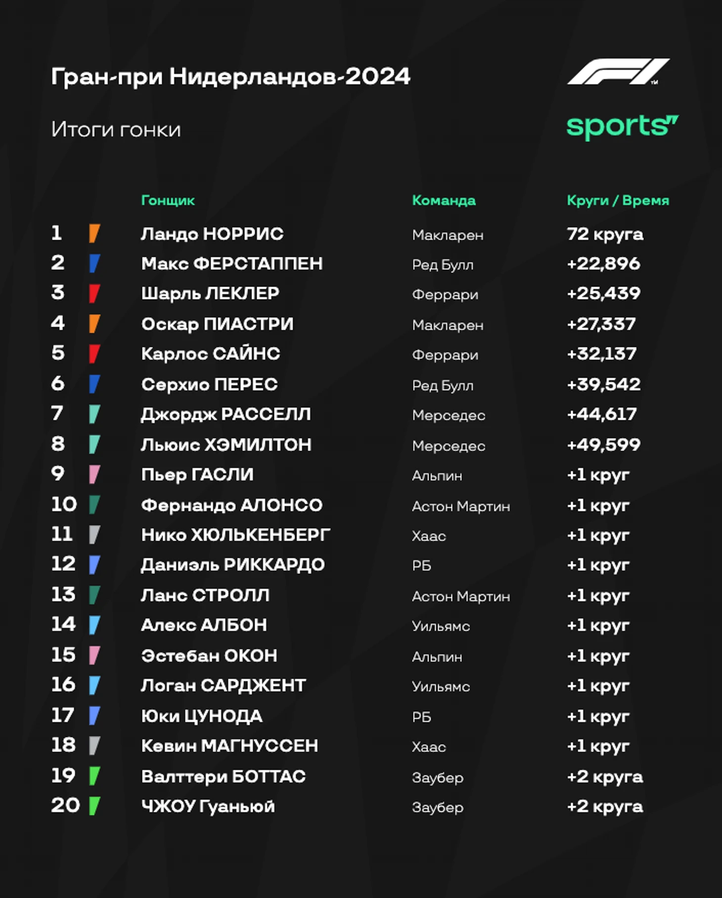 • Норрис вновь проиграл старт – Ферстаппен влетел в первый поворот лидером. Пиастри тоже столкнулся с перебором пробуксовки и упустил подиум в пользу Расселла. Леклер влетел в топ-5, Гасли телепортировался за Переса!