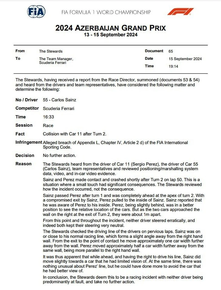 Что же все-таки произошло на предпоследнем круге и кто из двух гонщиков виноват в аварии? Стюарды Гран-при, в составе которых был экс-пилот «Ф-1» Джонни Херберт, посчитали столкновение гоночным инцидентом, не требующим штрафов – никто из пилотов не действовал необдуманно, рули держали нейтрально, придерживались первоначально выбранных траекторий.