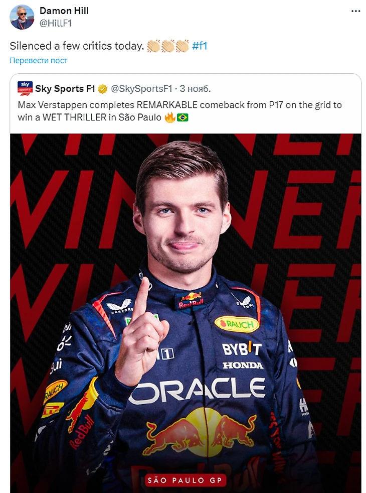 Даже британские эксперты и пресса признали поражение: бывший пилот и комментатор Sky Sports F1 Дэймон Хилл признался: «Заставил замолчать некоторых критиков». Кажется, чемпион 1996-го имел в виду и себя – ведь Дэймон много критиковал подход Макса как раз после Мексики и США:
