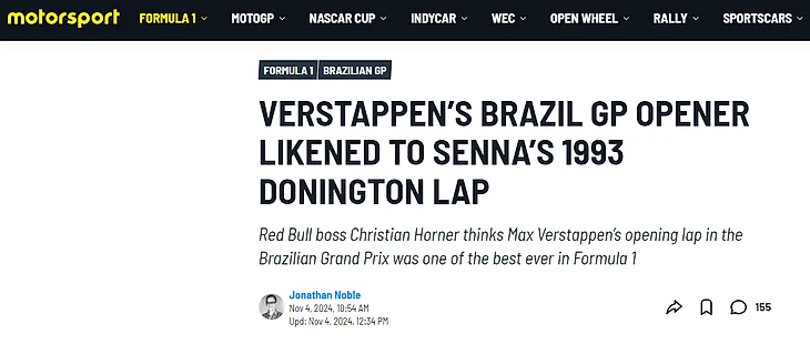 Редактор журнала Motorsport Джонатан Нобл (кстати, тоже британец) впечатлился тем, в каком стиле выиграл Гран-при Бразилии Макс Ферстаппен и выкатил материал, в котором также сравнил чемпиона мира с Айртоном Сенной, а именно гонкой 1993 года в Донингтоне.