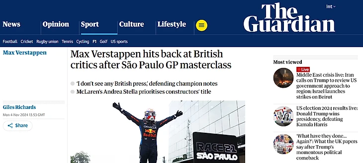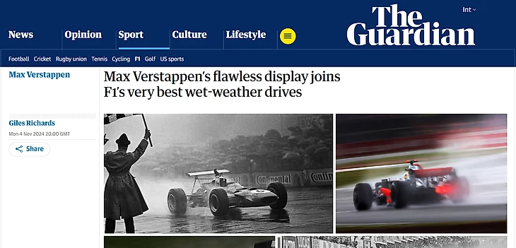Британский The Guardian выпустил целых два материала. В одном под авторством Джилса Ричардса был заголовок «Макс Ферстаппен отвечает британским критикам мастер-классом на Гран-при Сан-Паулу». Но стоп, ведь издание тоже базируется в Великобритании...