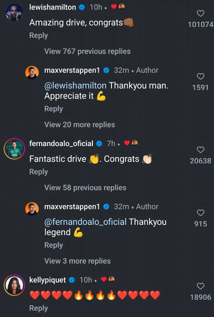 Главное, что получил Ферстаппен – признание от людей, у которых в общей сложности девять чемпионских титулов в «Ф-1». Речь о Фернандо Алонсо из «Астон Мартин» (2 победы) и Льюисе Хэмилтоне из «Мерседеса» (7 побед). Оба отметили то, как Макс чувствовал себя за рулем болида, но использовали немного разные эпитеты − «фантастическое» и «потрясающее». Много смайлов от Келли Пике − приятное, но ожидаемое дополнение.