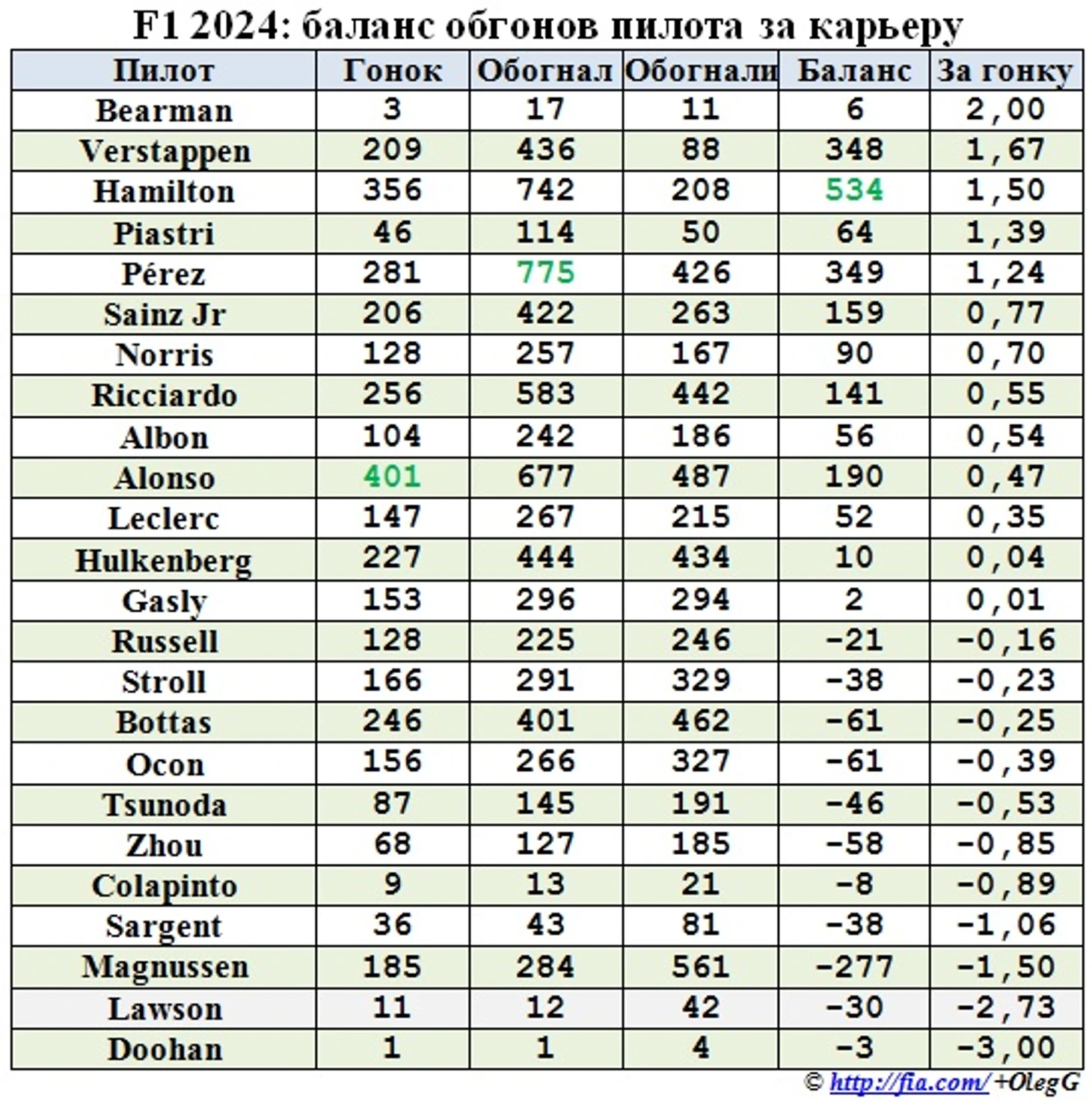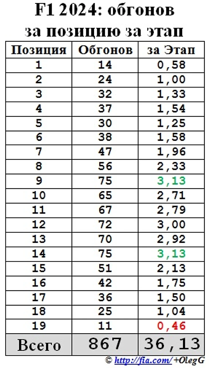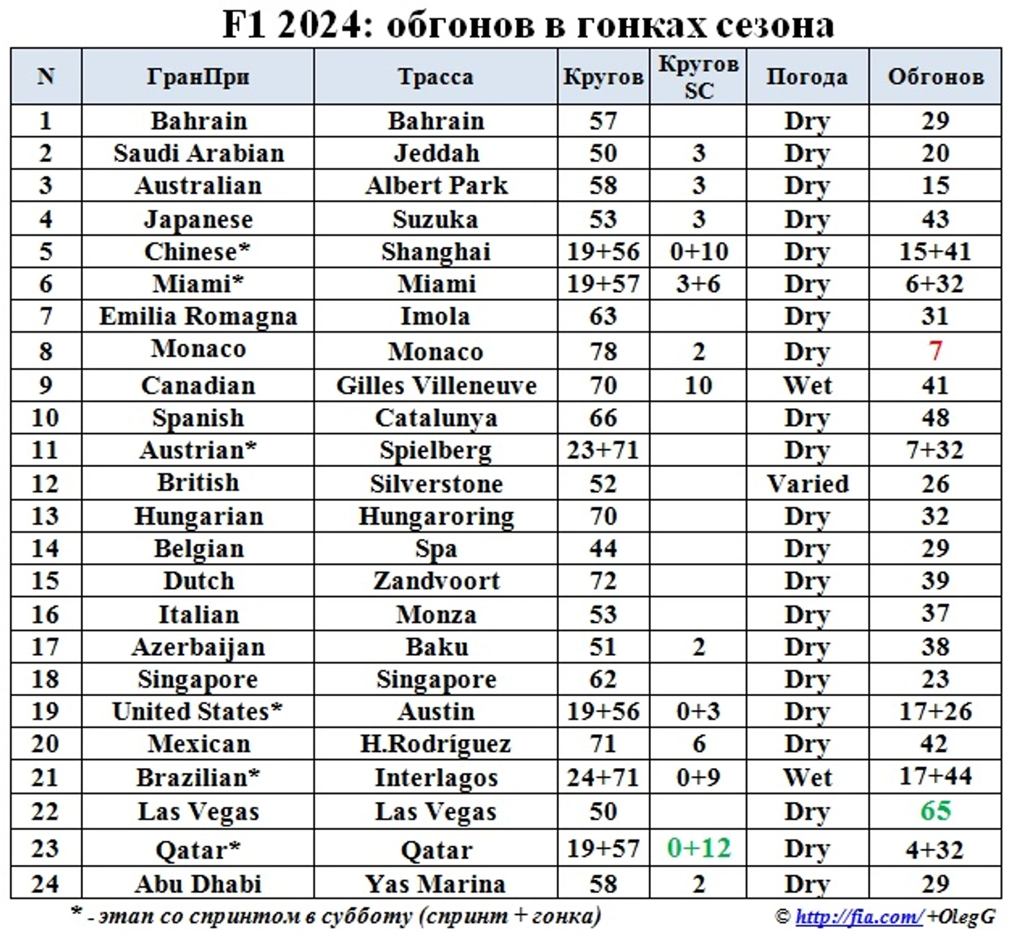 Итак, в сезоне 2024 я насчитал всего 867 обгонов. Из них на основные воскресные гонки приходится 801 обгон, а оставшиеся 66 - обгоны во время 6 субботних спринтов.