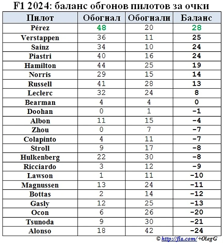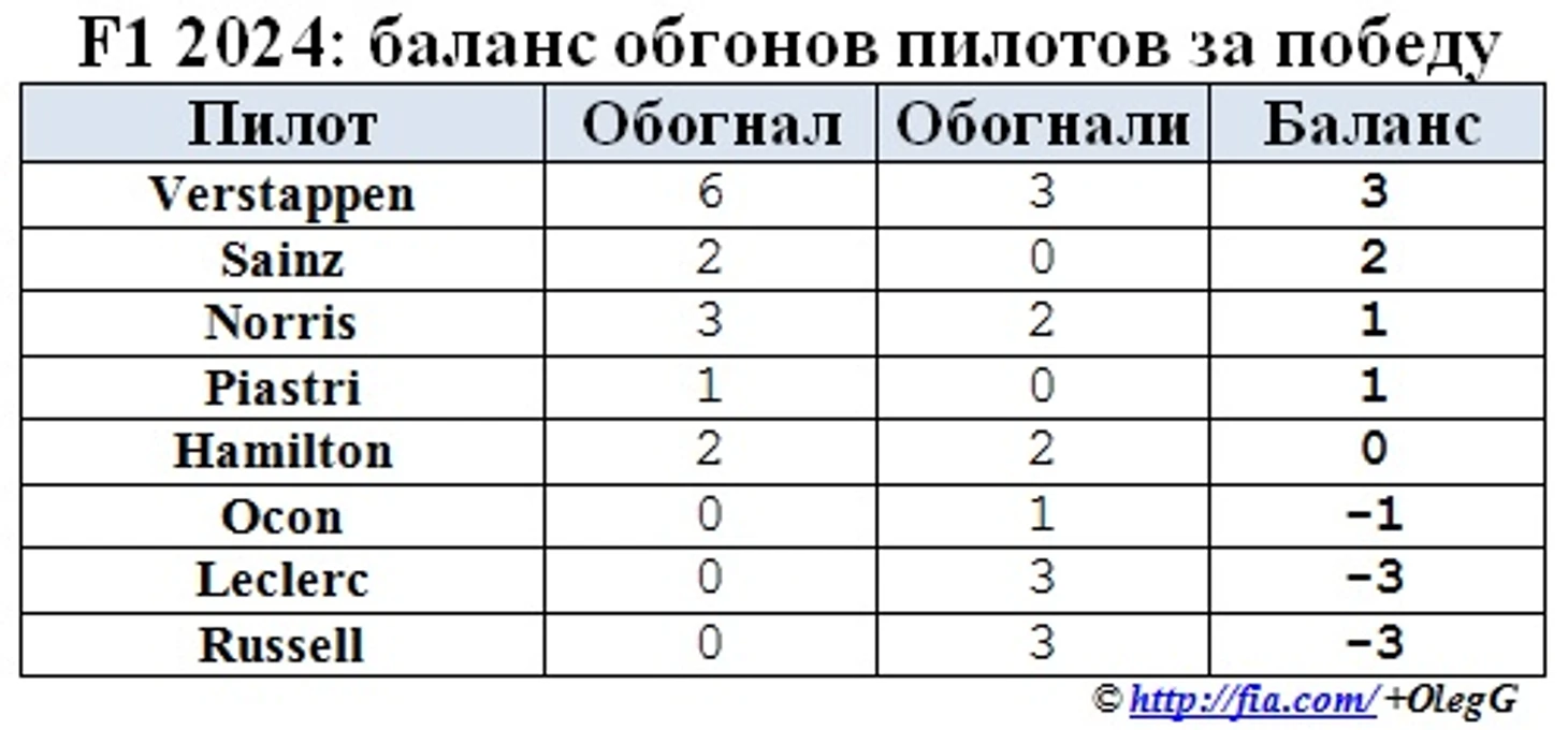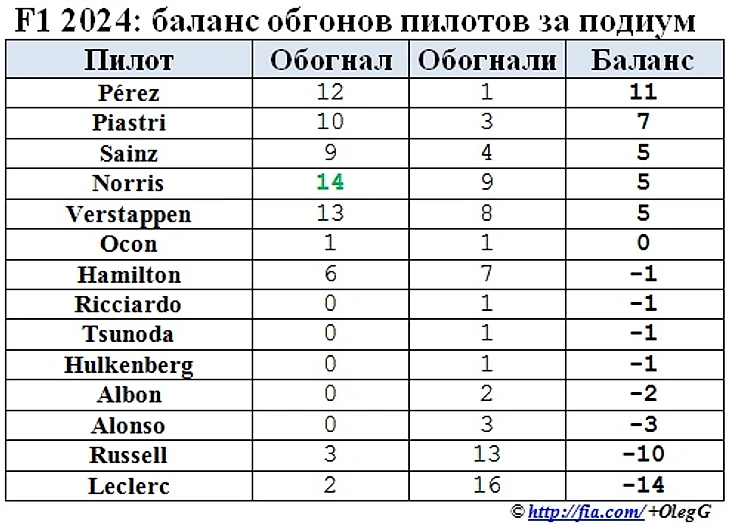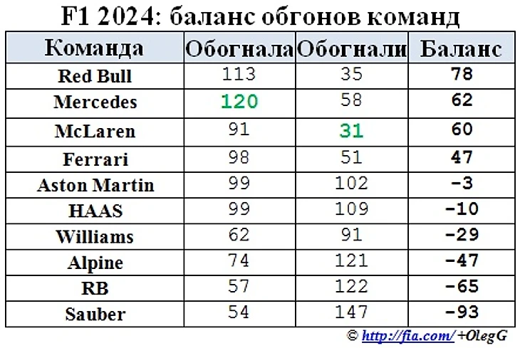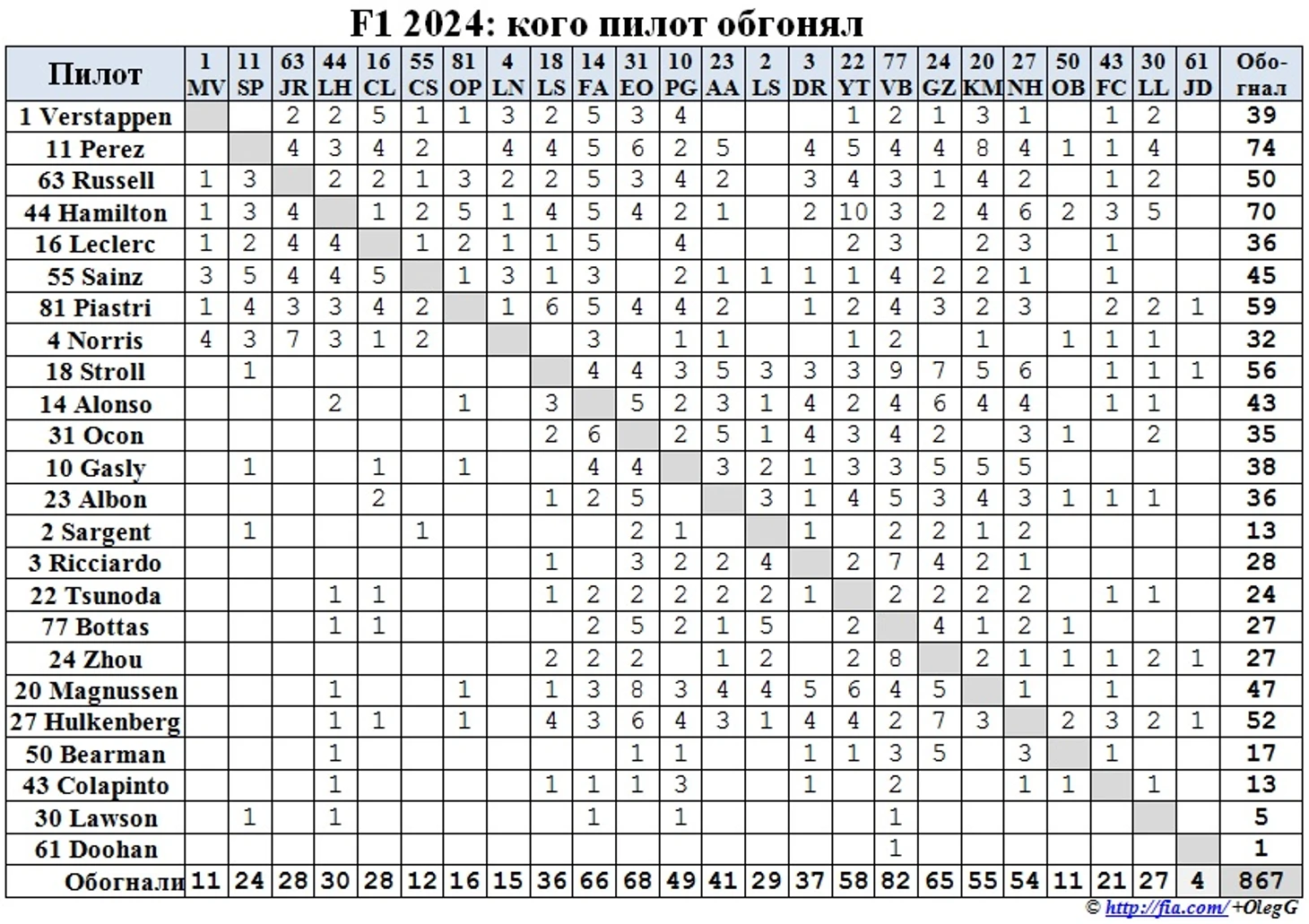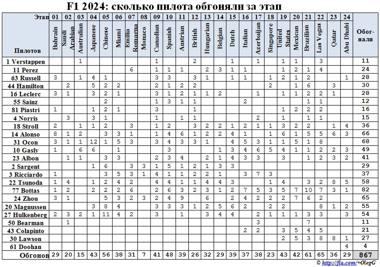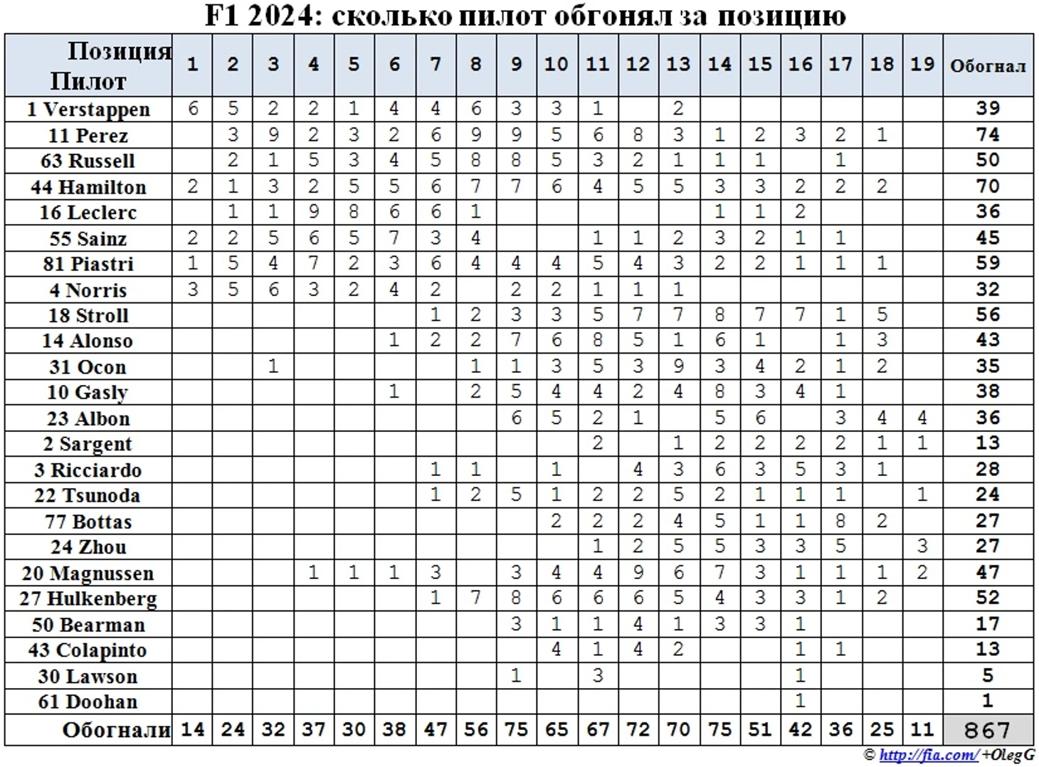 Теперь о том, кого и сколько раз в сезоне пилоты обгоняли: