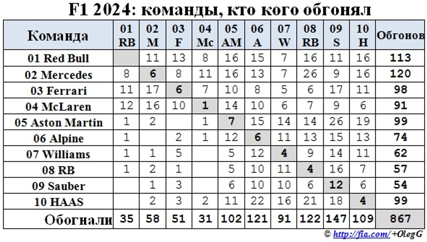 Не трудно догадаться, что в этой таблице по диагонали – «внутрикомандные» обгоны. Естественно, изменение позиций на трассе по указанию командного мостика, т.е. без очевидной борьбы напарников по команде, в данную статистику не входят.