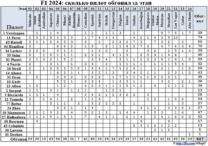 По ходу сезона-2024 после каждой гонки собирал информацию по обгонам. Для этого использовал покруговку гонок с официального сайта ФИА, дополненную информацией из трансляций. Также пригодилась информация о смене шин по ходу гонки с сайта «Пирелли».