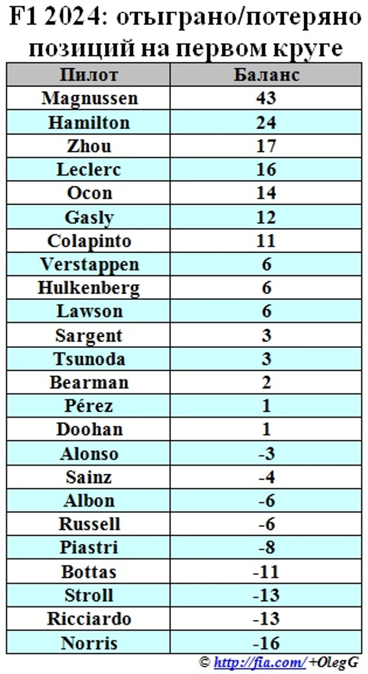 Т.к. интерес к данной составляющей перестановок по ходу гонки остается и есть предубеждения относительно того, кто больше всех проигрывал на первом круге, все-таки решил потратить время и собрать соответствующие данные по 6 спринтам и 24 гонкам в итоговую таблицу. Сход на первом круге, естественно, не входит в эту таблицу.