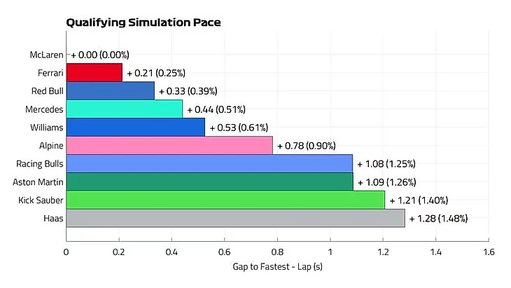 Темп «Феррари» на длинной дистанции не был особенно впечатляющим. Итальянцы теряли время на прямых, что может говорить о режимах работы двигателя, в то время как Хэмилтон начал симуляцию гонки в пятницу и прервал ее после 12 кругов. По данным Paceteq, время и деградация шин привели к тому, что он отстал от «Макларена» более чем на четыре десятых, как и его партнер Шарль Леклер днем ранее.