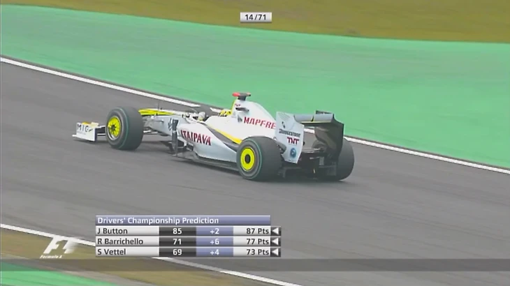 Здесь система предсказывает возможный отрыв одного из пилотов и шанс на подрезку/обгон.