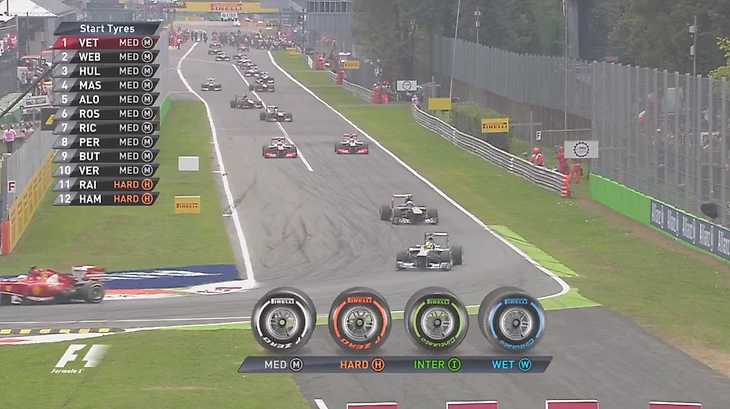 А еще наконец появилось обозначение шин, которые стоят на болидах: красная буква S − софт, желтая M − медиум, белая H − хард, зеленая I − промежуточные, синяя W − дождевые.