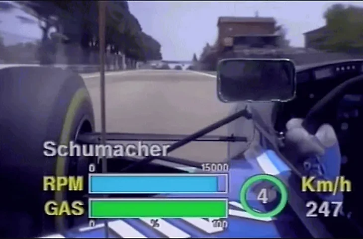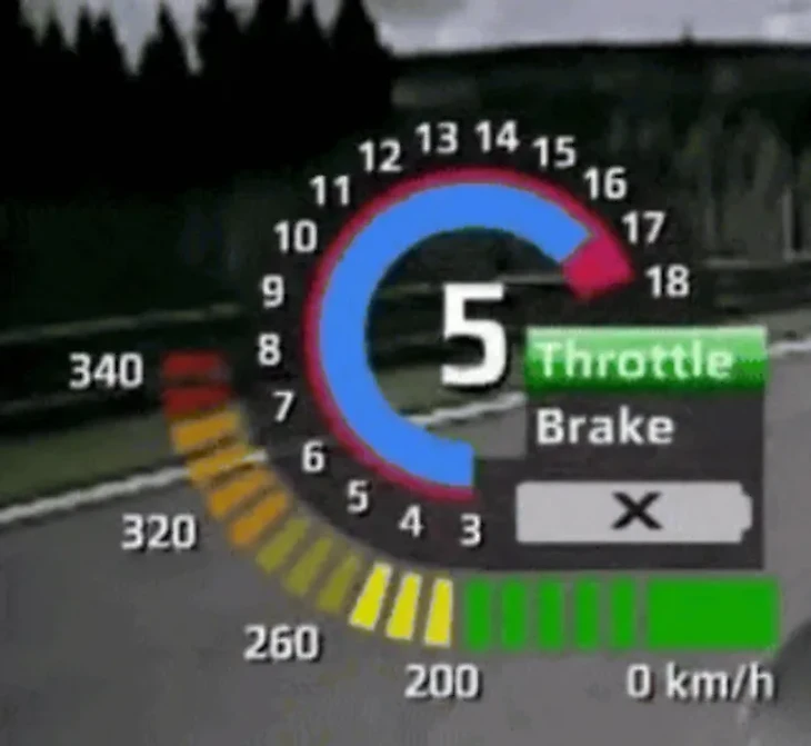 Графика, с одной стороны, усложнилась, так как стало больше данных; с другой, сделалась удобнее для зрителя, который погружен в «Формулу-1». Теперь на экран выводили данные по оборотам двигателя и работе педалью акселератора, номер передачи.