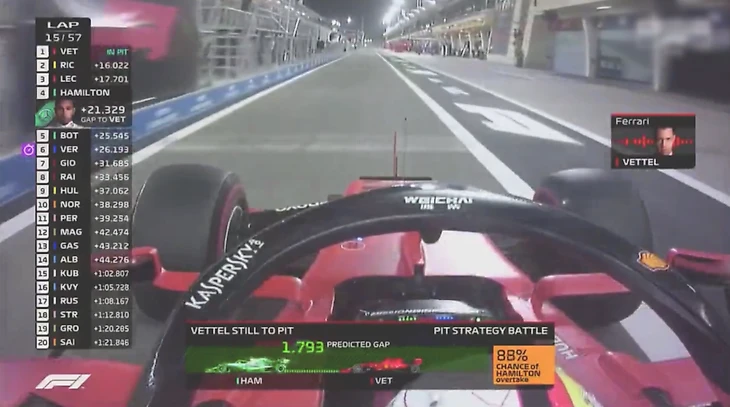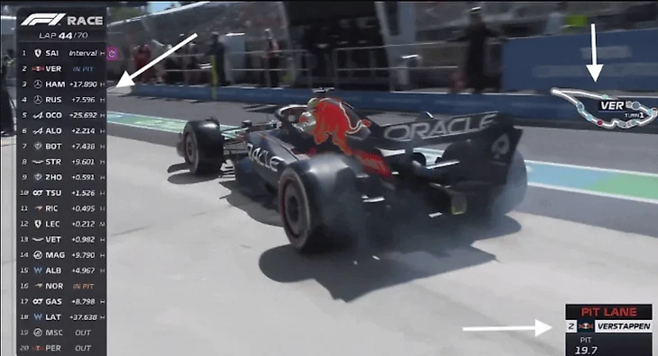 В конкретном случае – Макс Ферстаппен заехал в боксы, а кружки справа показывают, смогут ли преследователи обогнать его, пока он на питлейн.