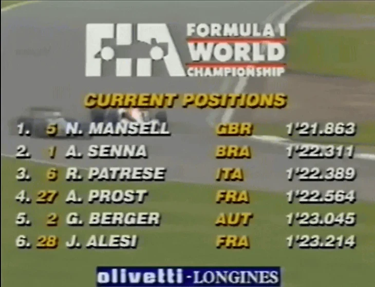 ● Сначала сравнение. Так в 1989-м на графике показывали борьбу «Макларенов» Айртона Сенны и Алена Проста: два болида, занимаемые места количество пит-стопов и разрыв. Больше ничего.