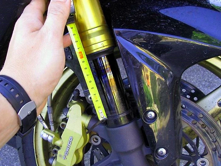 Сначала нужно отрегулировать преднатяг пружин обеих подвесок. Все действия нужно осуществлять вдвоем. Мотоцикл следует установить на ровную поверхность, сделать замеры, записать их. Возьмите сантиметр и определите расстояние от нижней точки заднего крыла до его оси. То же самое следует сделать с передним крылом – замер от верхнего траверса до оси. Измерения нужно сделать с посадкой байкера и без него. Полученные цифры сравните с указанными в мануале. Далее приступайте к регулировке.