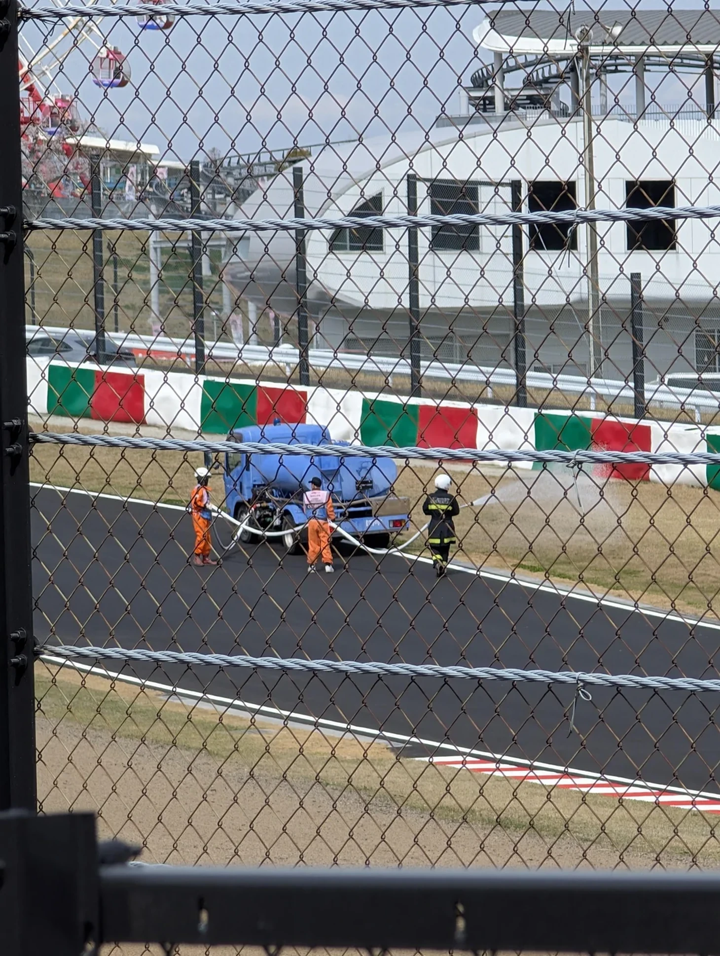 Вокруг японского трека прошлогодний газон. Свежая трава еще не успела появиться, а старая очень сухая из-за жаркой погоды. С похожей ситуацией сталкивались на прошлогодней гонке в Китае, но масштаб был сильно меньше. После того, как во второй практике впервые загорелся газон, дирекция гонки не могла предпринять глобальных мер, но после обработала всю обочину водой. Влага должна была предотвратить возгорание, но, как мы видим, такие методы совсем не помогли.