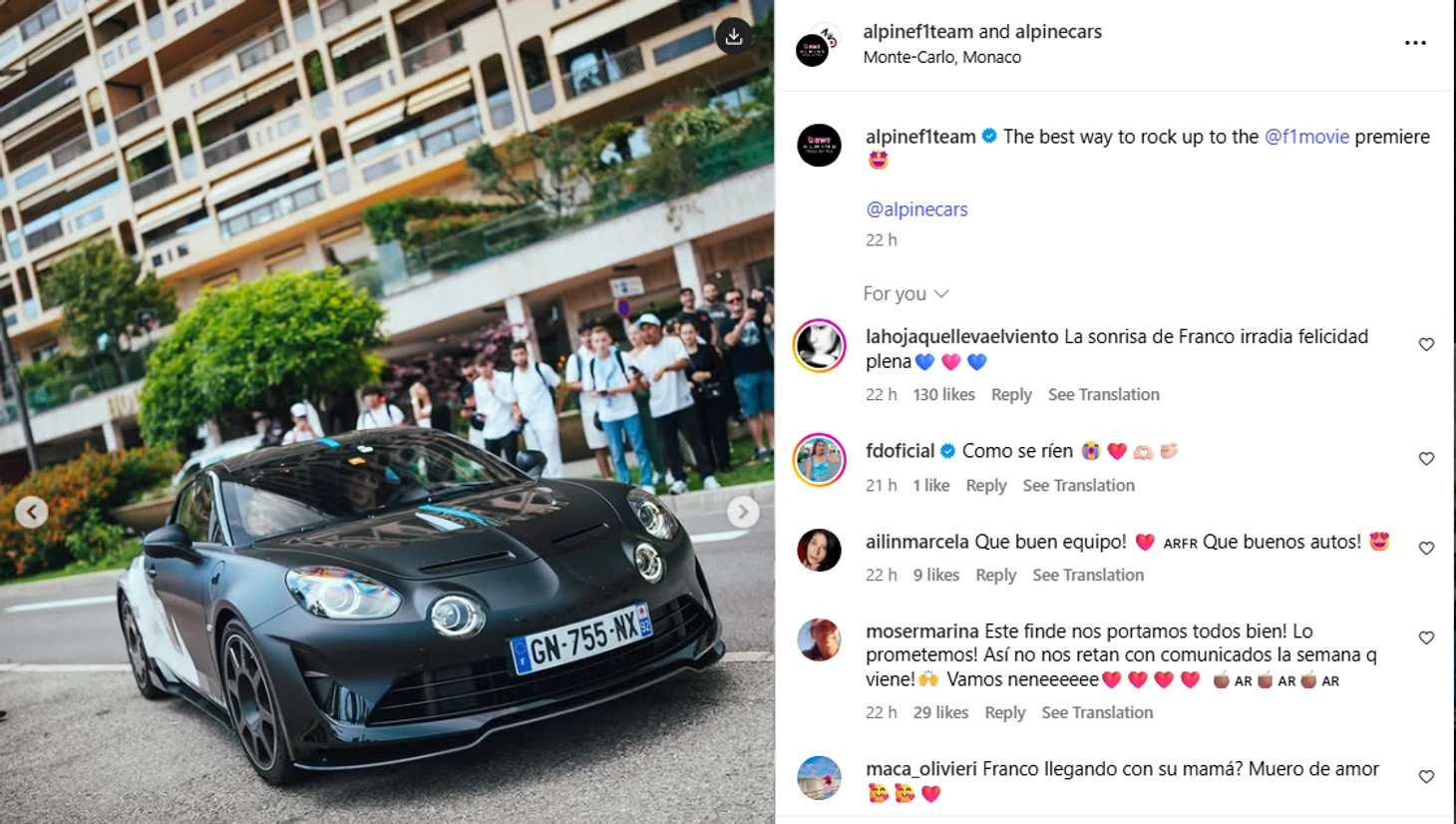 А бывшая команда Окона «Альпин» отрядила в Канны настоящий десант: обоих боевых гонщиков на последнем суперкаре компании. Причем Пьеру Гасли и Франко Колапинто обязательно было светить машину модифицированную A110S в кадре.