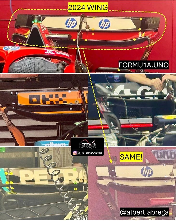 Главный элемент адаптации машин в таких условиях, помимо изменений в подвесках, – огромные задние антикрылья. Скудерия вообще привезла прошлогоднее – 2024 года – чтобы победить нехватку прижима и нестабильность в задней части.