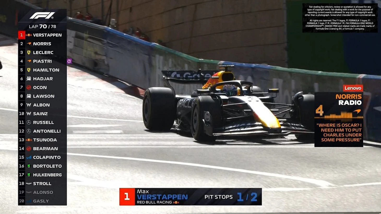 ● На 49-м круге Оскар заехал и на второй пит-стоп – вернулся позади Ферстаппена 4-м.