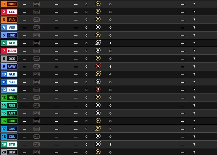 Лоусон – изношенный на 6 кругов «софт», Цунода – свежий, Гасли – прикатанный на 6 кругов «медиум», у Албона – проехавший 4 круга, у остальных – относительно свежий. Причем с Лоусоном команда попыталась обмануть соперников: прямо перед стартом ему сменили состав на желтые ободки.