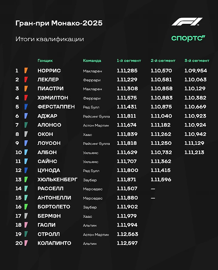 В самой квалификации же парад блокировок и аварий продолжился. Антонелли разбил машину о барьеры в конце первого сегмента, Хэмилтон заблокировал Ферстаппена, а болид Расселла отключился в туннеле из-за сбоя аккумулятора уже во втором сегменте. В итоге же несмотря на постоянное доминирование Леклера и «Феррари», поул на ленточке с рекордом круга и минимальным отрывом забрал Норрис – вспомнил, наконец, как собираются идеальные круги!