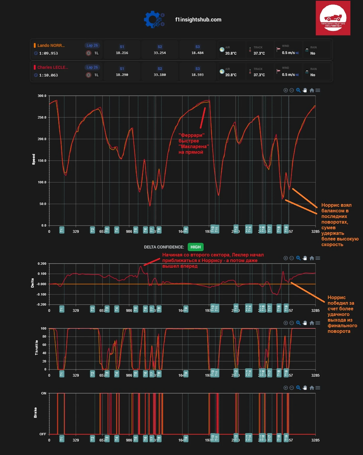 Леклер был быстр – его времени почти хватило для победы. Но Норрис оказался лучше в последних двух поворотах, из которых ключевым был финальный.