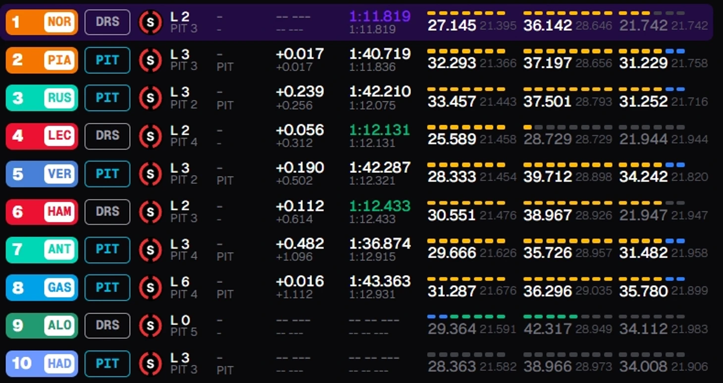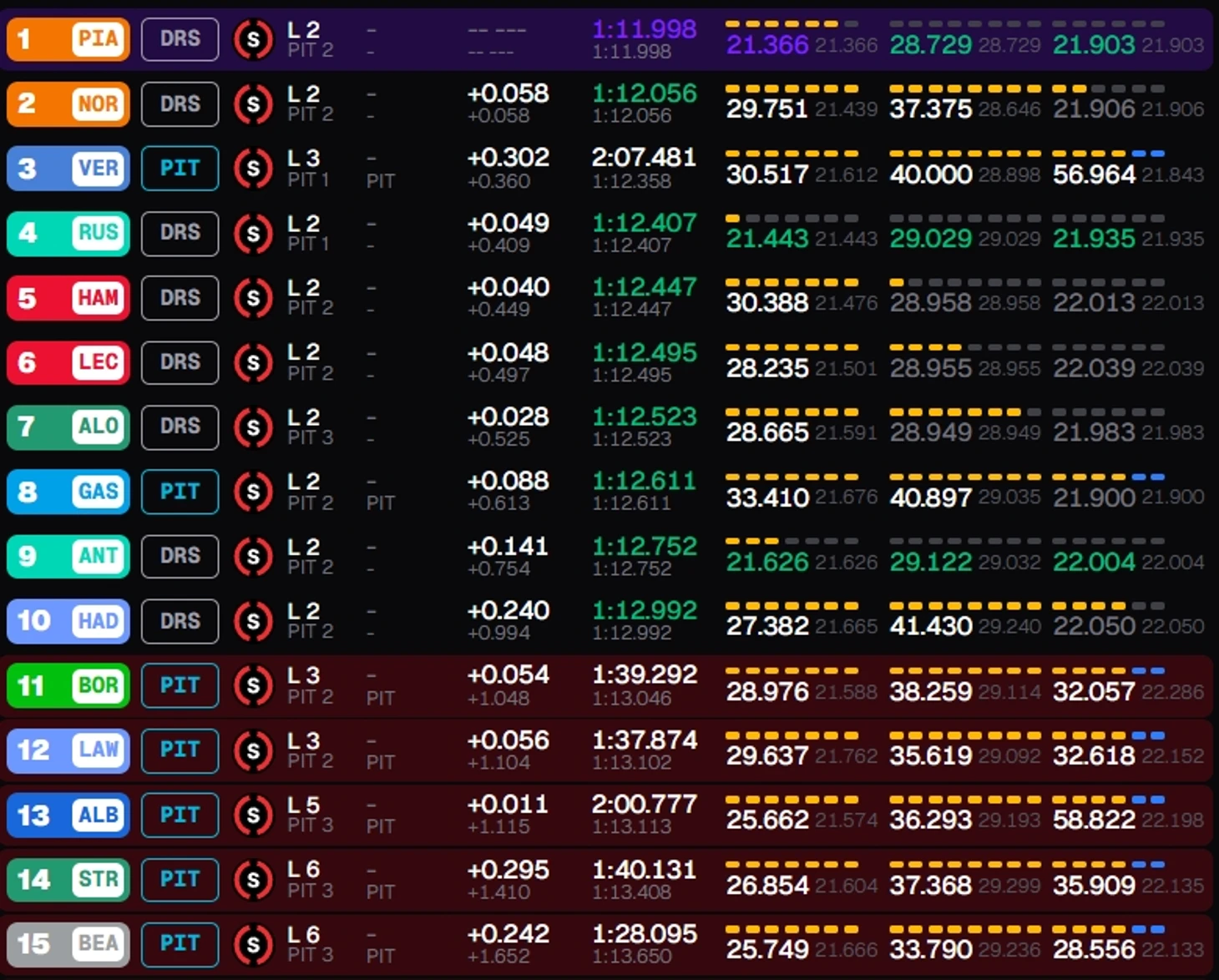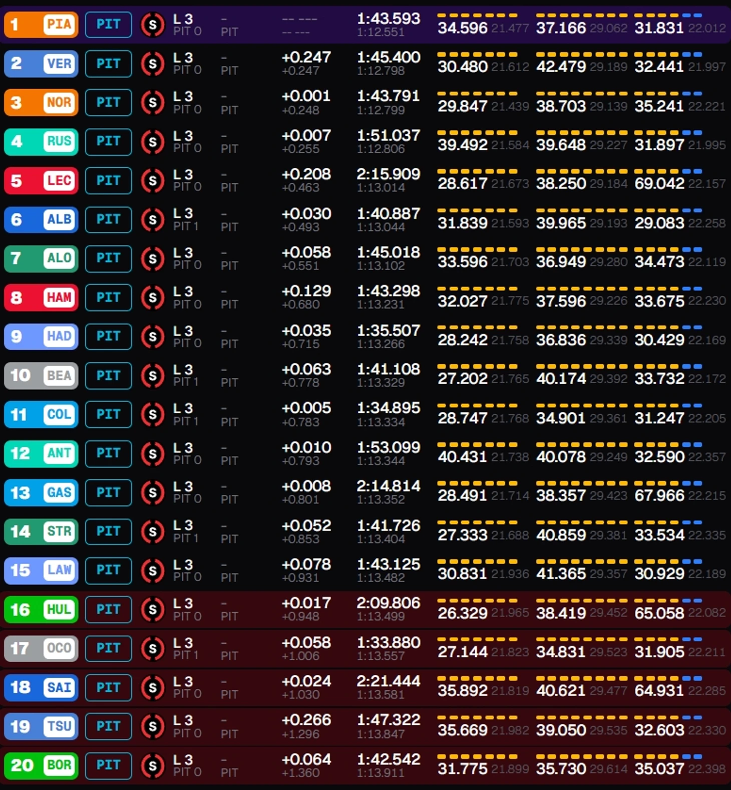 Очень плотная борьба, если не считать «Макларены»! Ферстаппен и Расселл проехали круги с абсолютно одинаковым временем! И Макс оказался впереди из-за очередности проезда кругов! Жальше Хэмилтон и Антонелли с Леклером. Гасли же обошел Аджара и Алонсо.