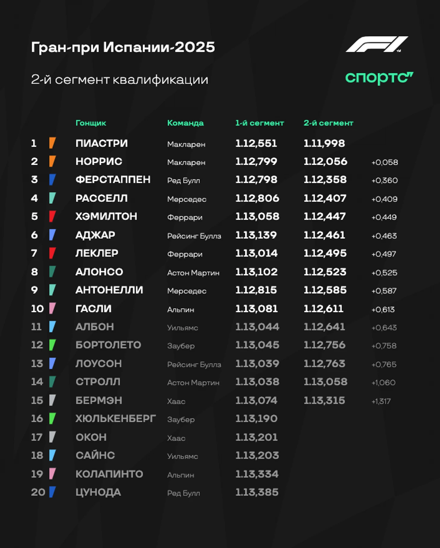 - «Мерседес», такое ощущение, как минимум в квалификации решили свои проблемы со скоростью болида в экстремально жарких условиях. В Барселоне, где сейчас очень жарко - трасса прогрелась до 41 градуса, воздуз до 28, - Джордж Расселл смотрится очень хорошо и чуть не обошел «Ред Бул». Антонелли менее опытный и пока проигрывает в скорости, но тоже не очень далеко.