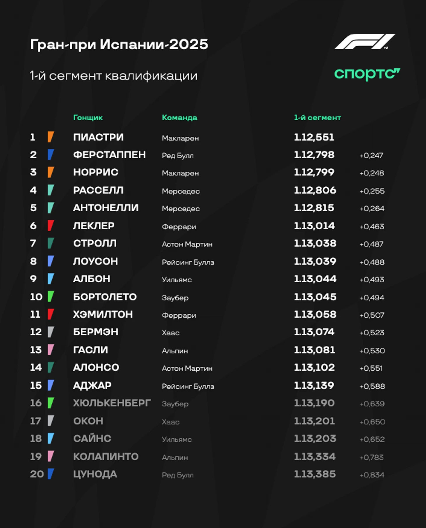 Итак, первые попытки позади. Впереди два «Макларена», Макс обошел Расселла и две «Феррари». Антонелли пока на грани вылета.