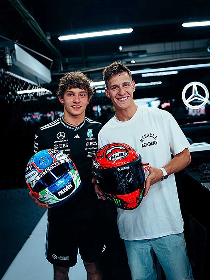 При обмене шлемами в резиденции «Мерседеса» с Кими Антонелли.