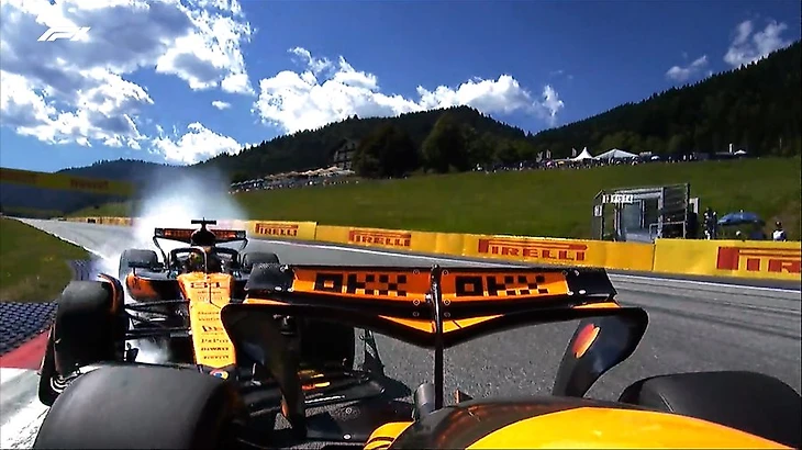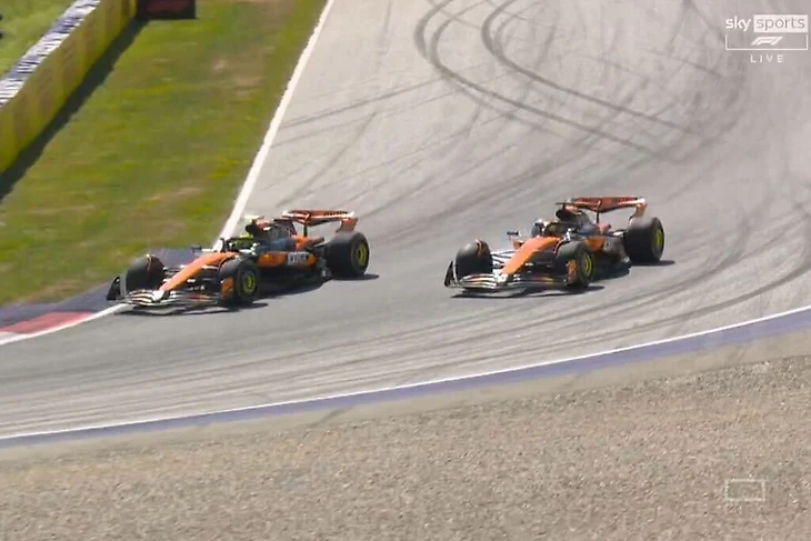 В Австрии напарники снова схлестнулись в борьбе. Пиастри сходу прошел «Феррари» Леклера и ринулся атаковать стартовавшего с поула Ландо. На жестком торможении в третьем повороте №4 удалось отбиться.