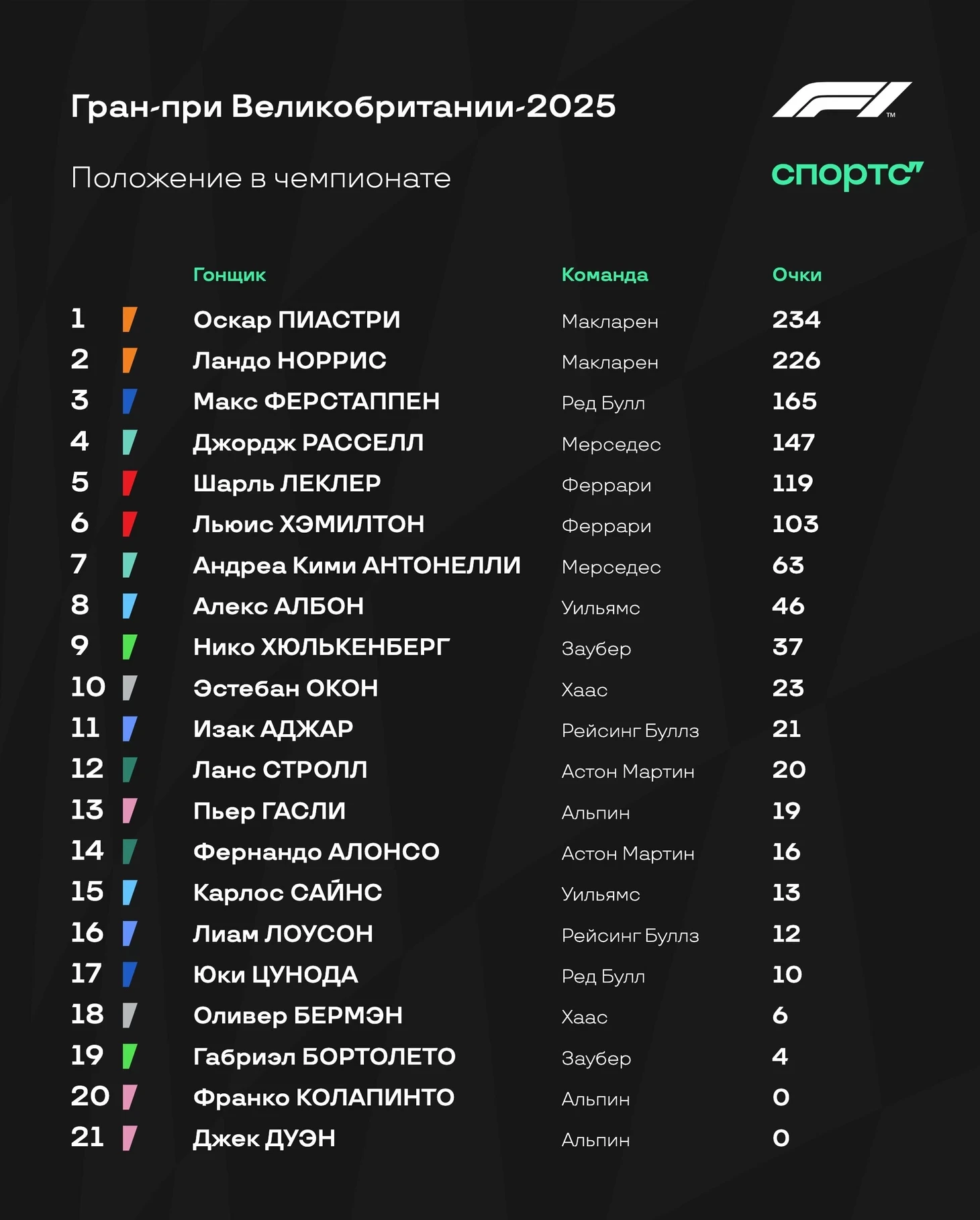 И как же все изменилось сейчас! За первую половину 2025-го Ферстаппен отстал от главных претендентов на титул из «Макларена» уже на 60-70 очков (3 чистые победы при двойных сходах Норриса и Пиастри) – у Макса математически больше шансов упасть на четвертое, ведь Джордж Расселл позади всего в 18 баллах и уже брал поулы с гонками в этом году.