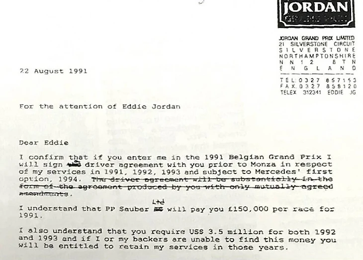 Тут все куда сложнее. И хотя да, контракта между Шумахером и Джорданом не было. Но вот договор – был. На подготовку полноценного контракта требовалось время, переговоры продлились до четверга, а в пятницу утром уже надо было садиться за руль. Так что Эдди попросил Шумахера предоставить что-то вроде гарантийного письма, с обязательством подписать контракт перед Монцей. Шумахер его предоставил – при этом в окончательную версию были от руки внесены изменения, с виду не особенно важные, но на самом деле создавшие некоторую юридическую двусмысленность, за которую позже и зацепились адвокаты.