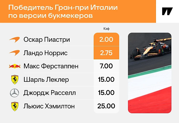 На Гран-при Италии букмекеры впервые за несколько гонок заметно развели шансы пилотов «Макларена». Если в Зандворте кэфы были почти равными – 2.25 на Пиастри и 2.35 на Норриса, то теперь разница ощутимая – 2.00 против 2.75.