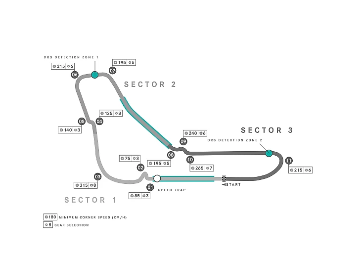 Однако поставщик резины «Пирелли» оценил нагрузку на шины только в 3 из 5 – ведь из-за длинных прямых покрышки можно охлаждать. Такой же уровень у требований к разгонам, а боковые перегрузки вообще 2 из 5. Требования к прижимной силе – 1 из 5.